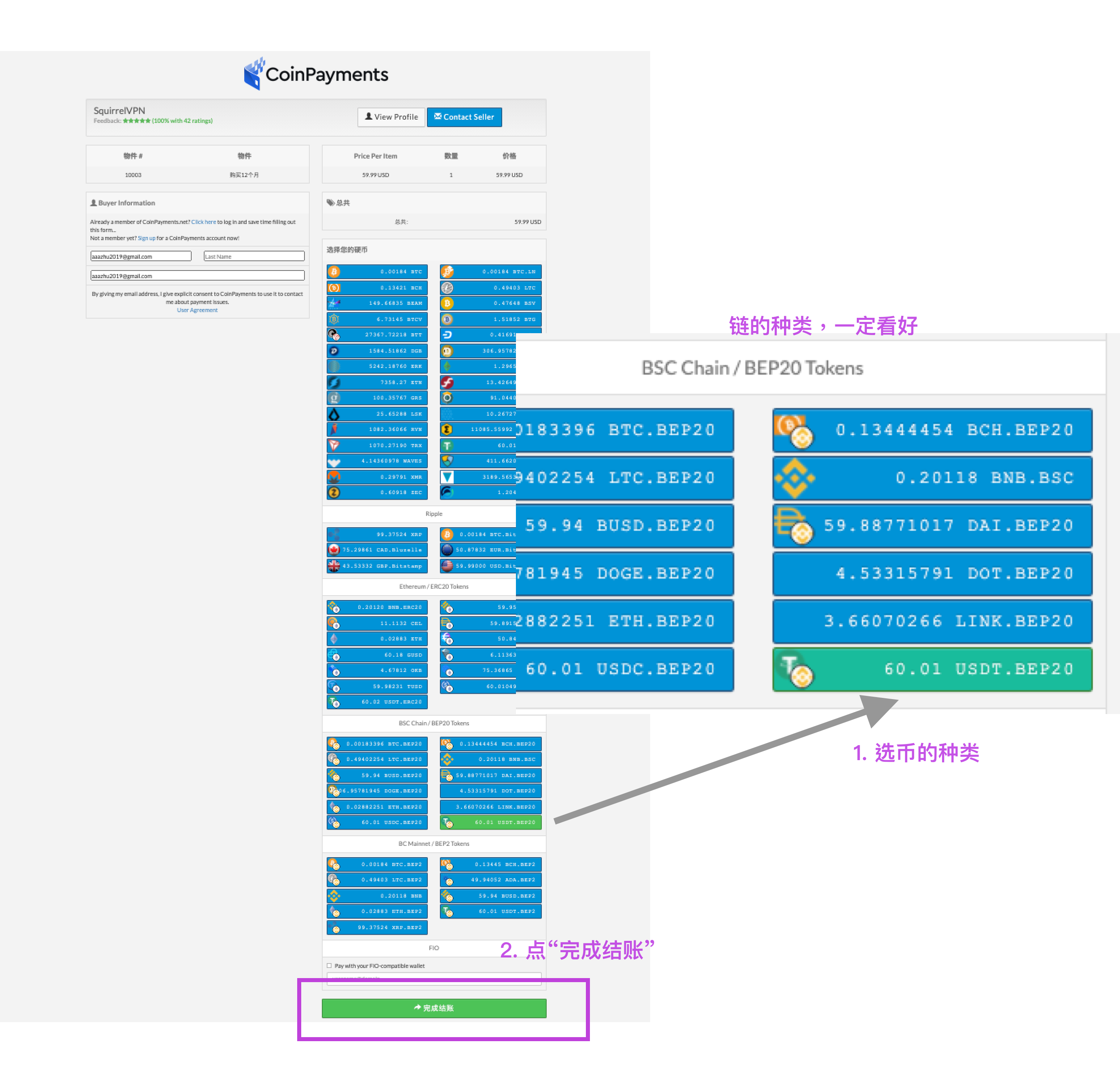 接上一篇教程,您已经有了USDT/BTC现货,如何使用您的加密货币支付给松鼠VPN呢?
